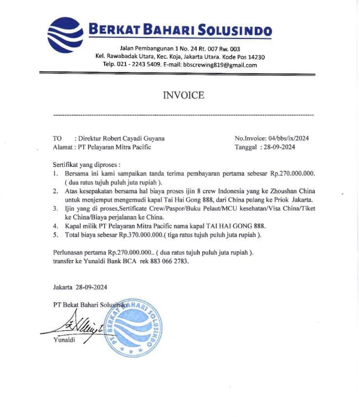 PT. Berkat Bahari Solusindo Dan PT. Mitra Pasifik Diduga Lakukan Kleim Asuransi Pelayaran Dengan Dokumen Palsu